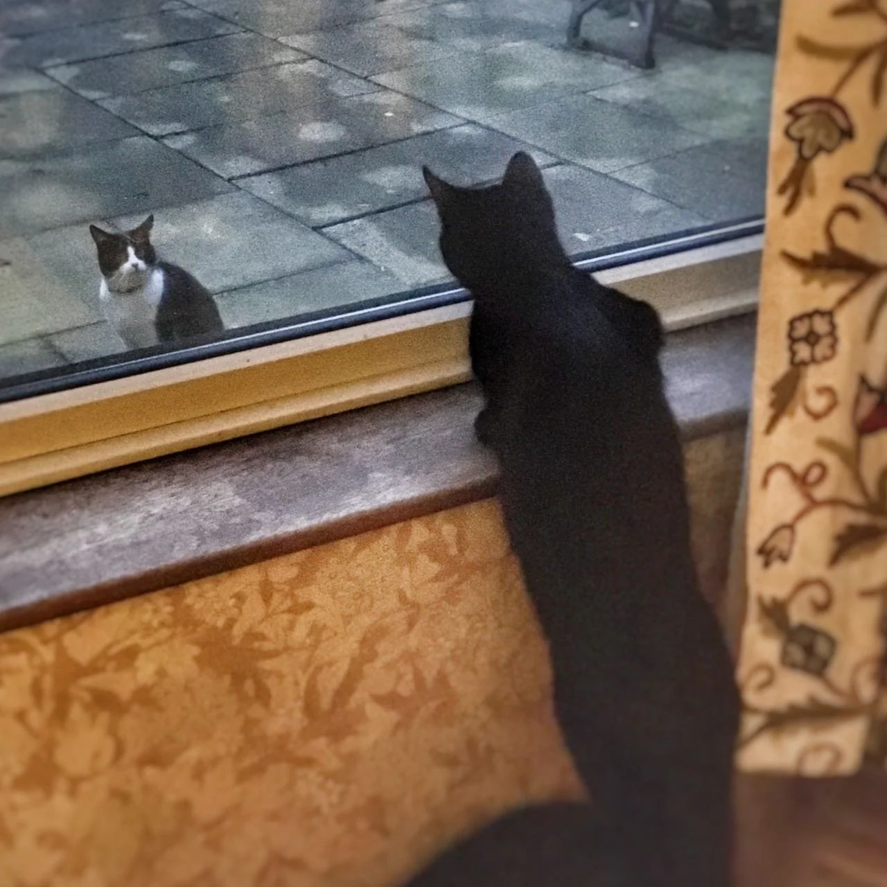 The two cats would gaze at each other for hours, Stormy inside from a window ledge, the tom in the cold garden. For his part, he was committed to this pursuit- regardless of the weather or time of day, he was there….waiting his moment.