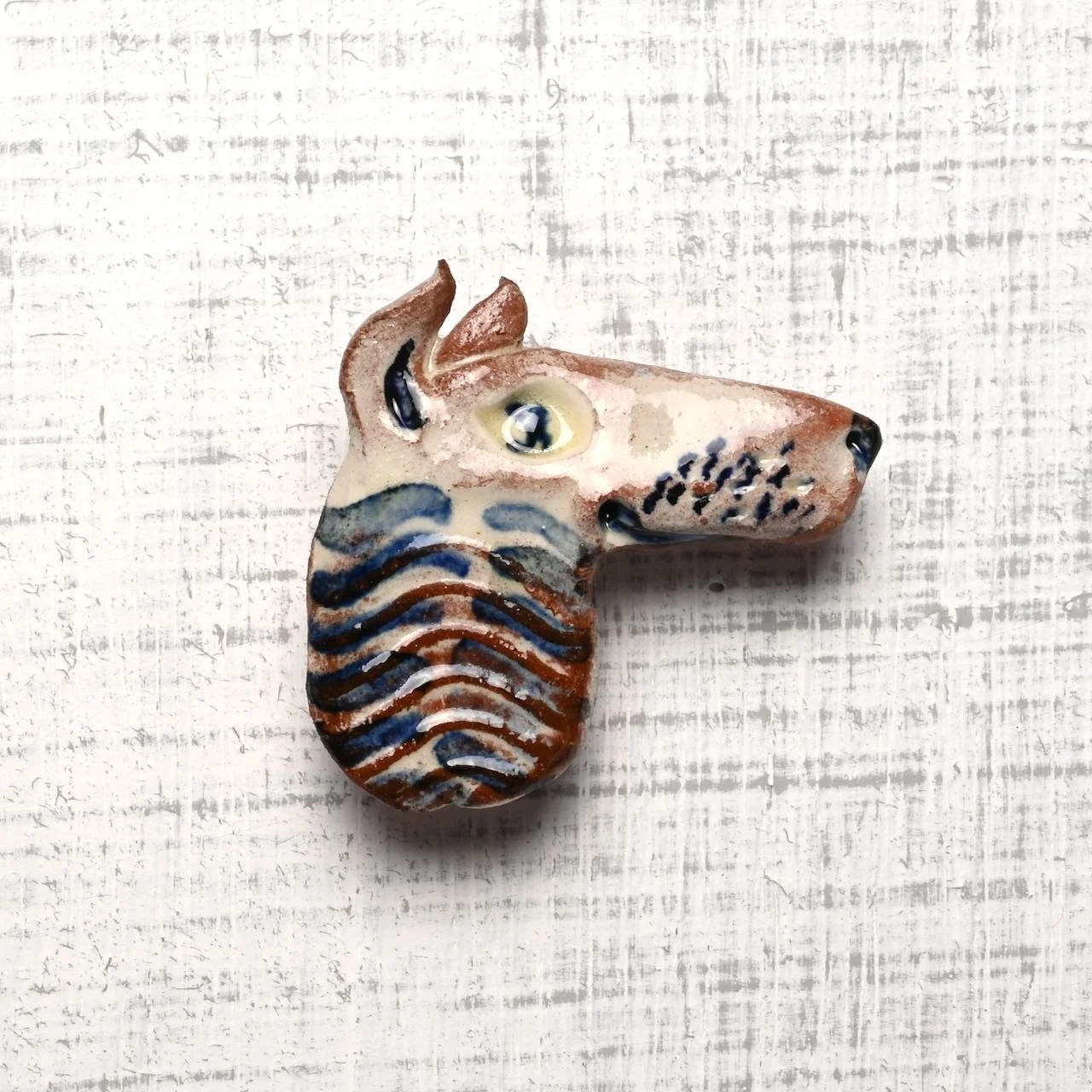 An original hand-modelled ceramic brooch by Jeremy James. This is a unique piece made by Jeremy James in his Derbyshire studio. Pin or button clasp on the reverse.